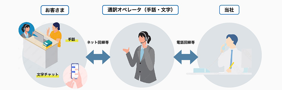 ※3 電話リレーサービスは、聴覚や発話に困難のある人(きこえない人)と、きこえる人(聴覚障害等以外の人)との会話を通訳オペレータが「手話」または「文字」と「音声」を通訳することにより、電話で即時双方向につながることができる、法律に基づいた公共インフラとしてのサービスです。詳細は、一般財団法人日本財団電話リレーサービスのホームページをご参照ください。
