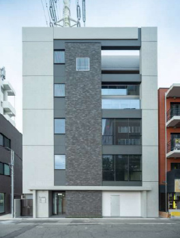 成城学園前駅の街並みに馴染む落ち着いた色合いの外観は、コンクリート打ち放しならではのシャープさを生かしつつ、中央部分は様々な色合いが混ざり質感が感じられるレンガ調タイルをアクセントとして組み合わせました。