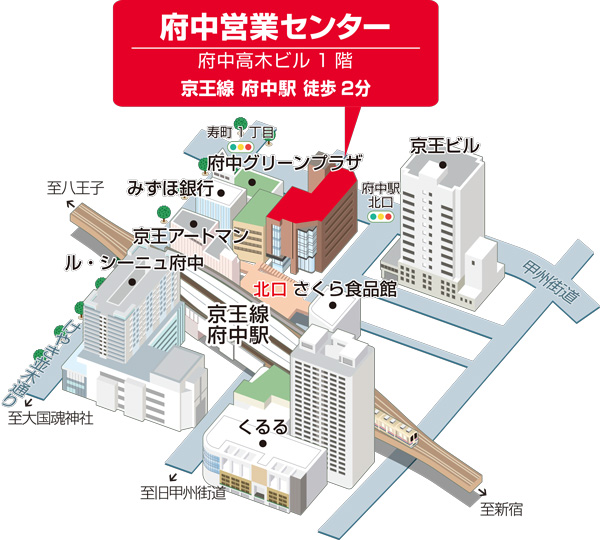 府中営業センターは、京王線 府中駅より徒歩2分の府中高木ビル6階で営業しておりましたが、このたび同ビルの1階フロアに移転いたしました。