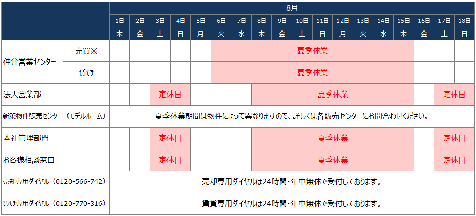 [本社投資マンション営業センターは8月7日(水)より8月15日(木)まで夏季休業]